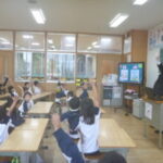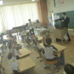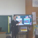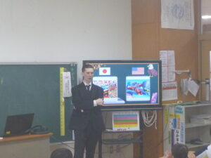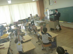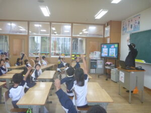 アメリカ出身の射水市国際交流員ギャレット先生から、日本とアメリカの学校や行事、季節の違いなどを教わりました。アメリカの学校では、「外履きのまま校舎に入るよ。掃除は子供や先生ではなく、業者さんがするんだ。」とギャレット先生から聞いて、「えーっ!掃除しなくていいのはいいな!」「でも内履きをはいたほうが学校の中が綺麗でいいのにね。」と、他文化のよさも自国の文化のよさも感じていた子供たちでした。