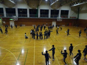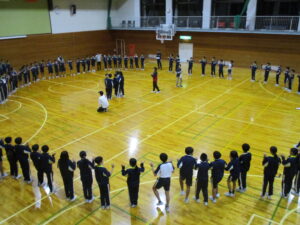 夜は、ゲーム集会を行いました。各クラスで考えた「震源地ゲーム」や「人間指すま」「360度だるまさんが転んだ」「かぶっちゃやーよ」のゲームをみんなで楽しみました。より一層、班のみんなと仲が深まりました。