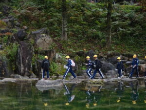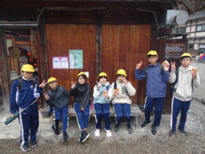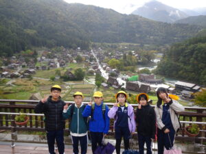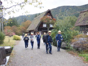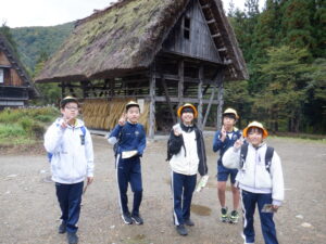 翌日28日には、世界文化遺産に指定されている白川郷を訪れ、合掌造りを見学したり、歴史ある町並みを散策したりしました。散策では、それぞれの班がみんなと話し合ってコースを決め、展望台から街並みを見渡したり、地元ならではの美味しいものを食べたりするなど白川郷を満喫しました。この2日間で、仲間との絆を深め、楽しい思い出をつくることができました。