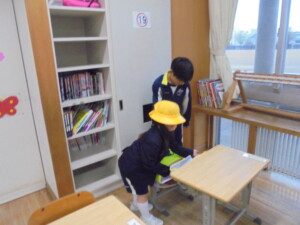また、入学式を終え、1年生の朝の支度を手伝っています。
