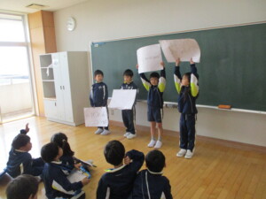 入学おめでとう集会に向けて、4年生は学年一丸となって、クイズとお祝いの言葉の発表に向けて準備をしました。全員が役割をもち「1年生に喜んでもらおう」と取り組む姿が見られて、頼もしかったです。